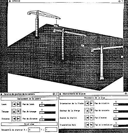 To visualize the cranes that they have modelled, the students have to define the position of the camera and the type of projection to be used. So they need to study the viewing pipeline and the viewing model in PHIGS, the different parallel and perspective projections, and the different PHIGS attributes. An example picture is shown in Figure 3.