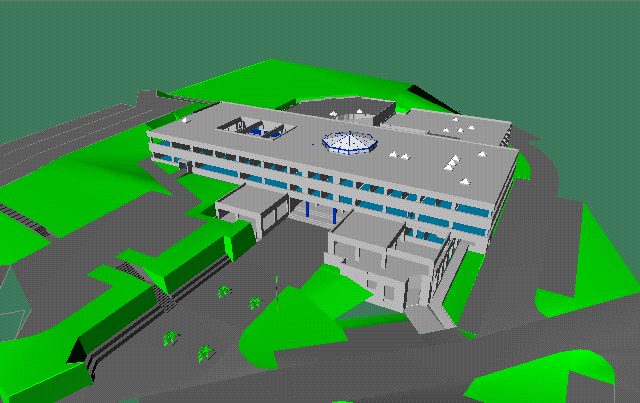 This was a four-student project. The main aims were to explore the field of VR; to use AutoCAD to model the buildings (This would have been too difficult using PHIGS or OpenGL); to use VRML to construct the virtual walkthrough. It was also a multimedia project; if you click on to a specific desk, a teacher will appear and speak.... (See Figures 5 and 6, or http://www.essi.fr/~sander/proj/EssiVR.